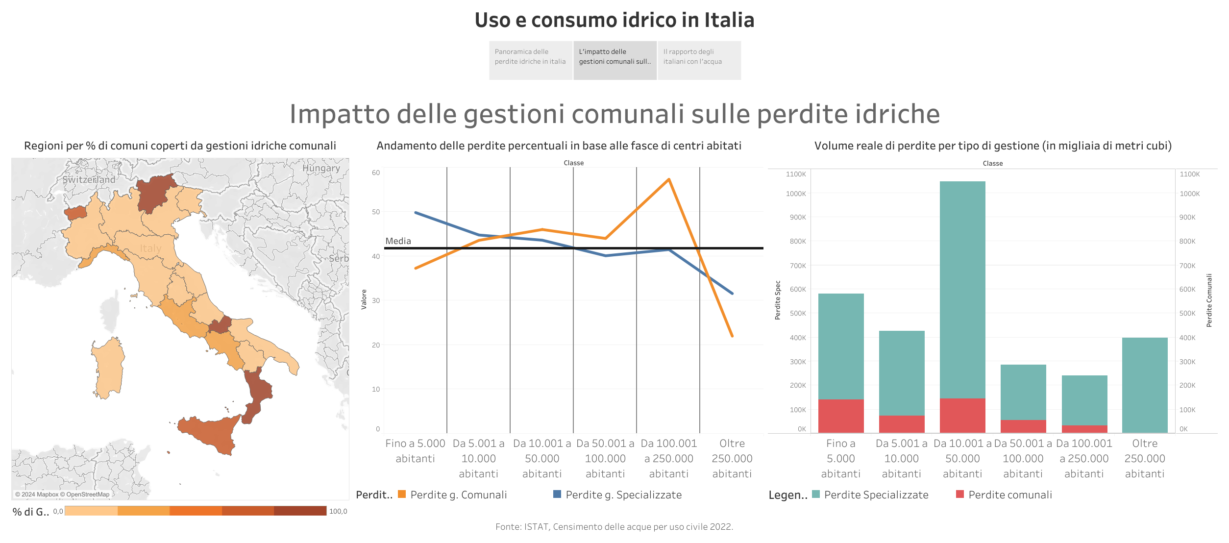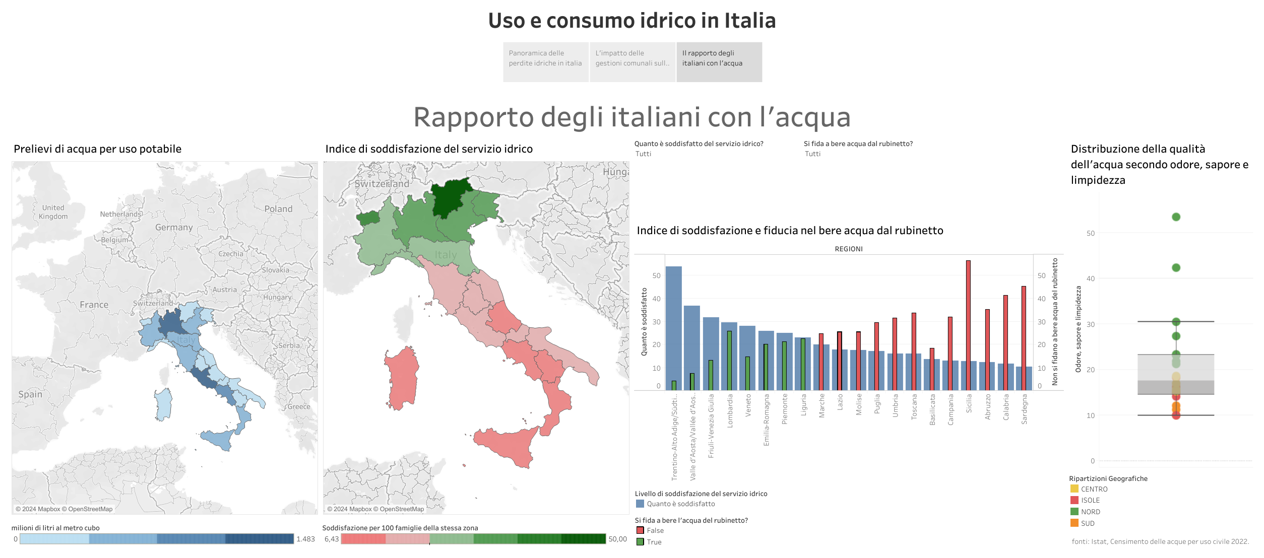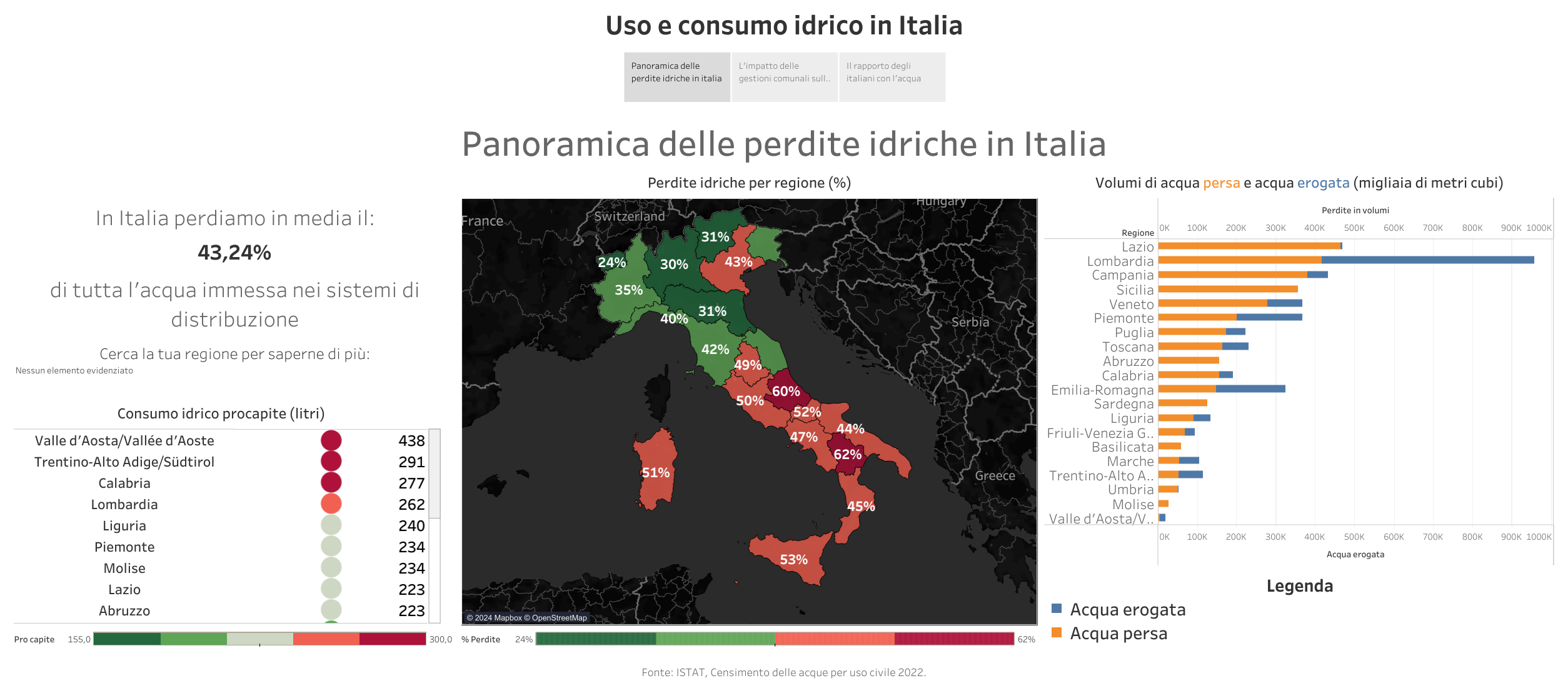 Questa visualizzazione non solo offre un'istantanea delle criticità legate alla gestione delle risorse idriche, ma si propone anche come strumento per sensibilizzare e informare sul tema della sostenibilità ambientale. Attraverso grafici intuitivi e interattivi, il progetto mira a rendere accessibili dati complessi, facilitando la comprensione di un problema che riguarda da vicino ogni cittadino italiano.